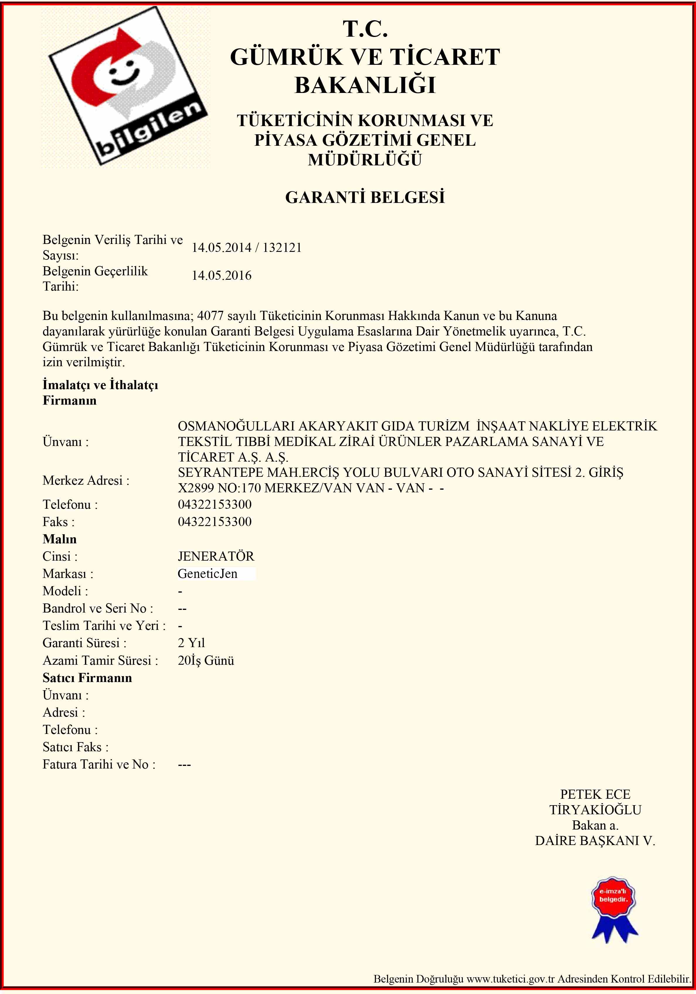 | "Doğru Seçim Güç Getirir" felsefesiyle yola çıkan Genetic Jeneratör 2.5 kVA - 2250 kVA güçleri arasında dizel jeneratör setleri, ses izolasyon kabinleri, her tipte kontrol ve güç transfer panoları üretimi yapmaktadır. Dünya kalitesi standartlarında Ankara'da üretilmiş dizel jeneratör setleri ve opsiyonel donanımlarıyla Türkiye'den tüm Dünya'ya üretimini sergilemekte ve satışını yapmaktadır.. |